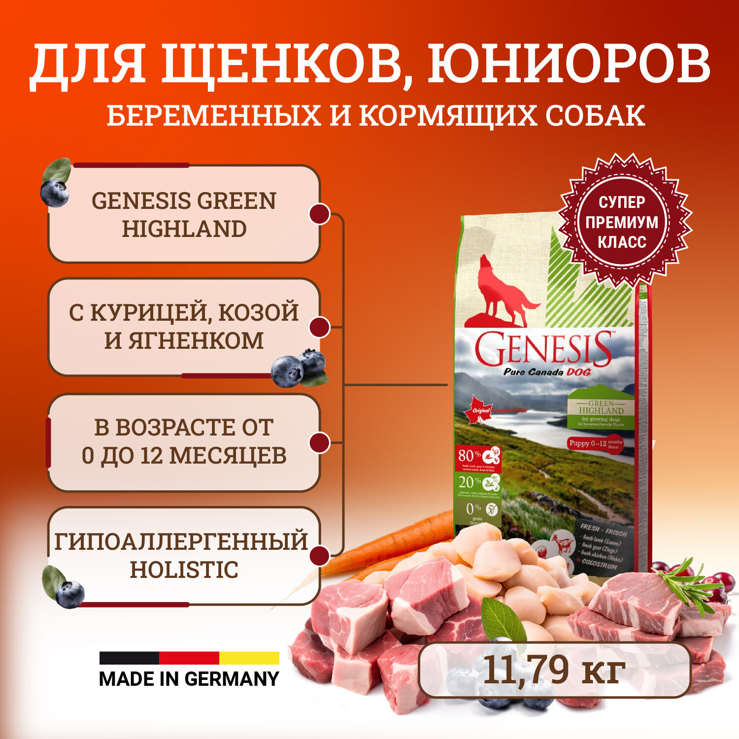 Генезис Зеленое Нагорье для щенков, юниоров, беременных и кормящих собак с курицей, козой и ягненком / Genesis Green Highland 11,79 кг