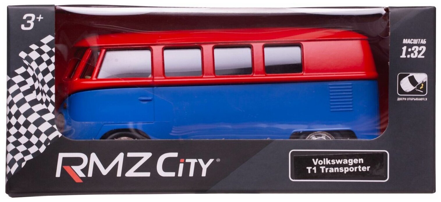 Машинка металлическая Uni-Fortune RMZ City серия 1:32 Автобус инерционный Volkswagen Samba bus Transporter, цвет матовый красный с синим, двери открываются