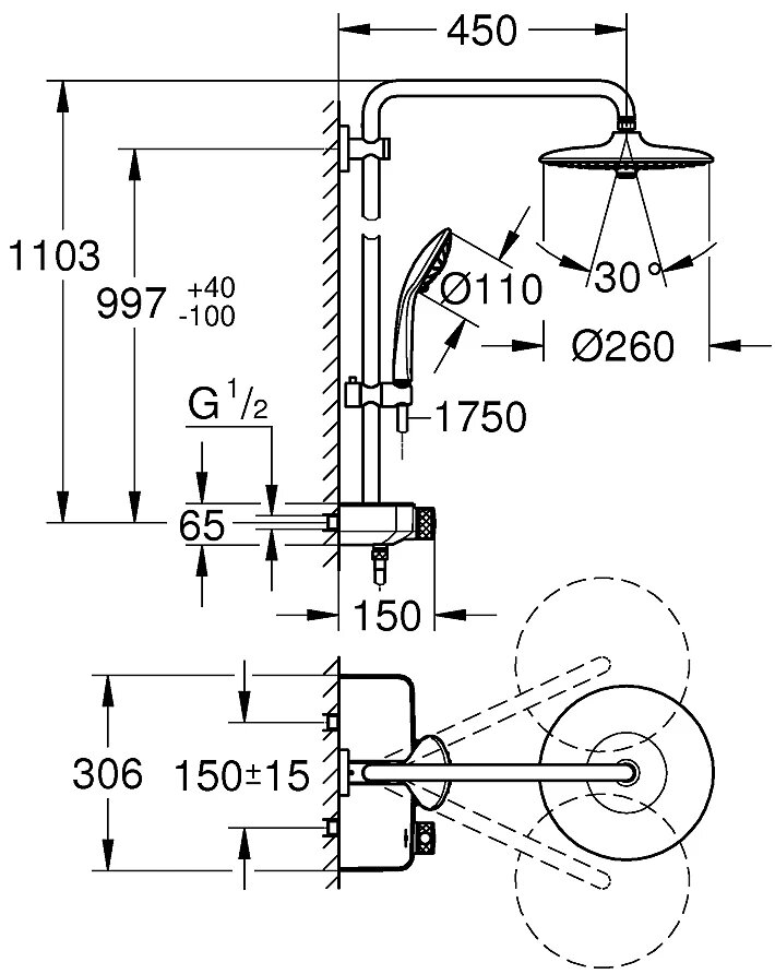 | Дополнительная информация | высота стойки для душа: 1103 мм; диаметр душевой лейки: 110 мм; диаметр верхнего душа: 260 мм |