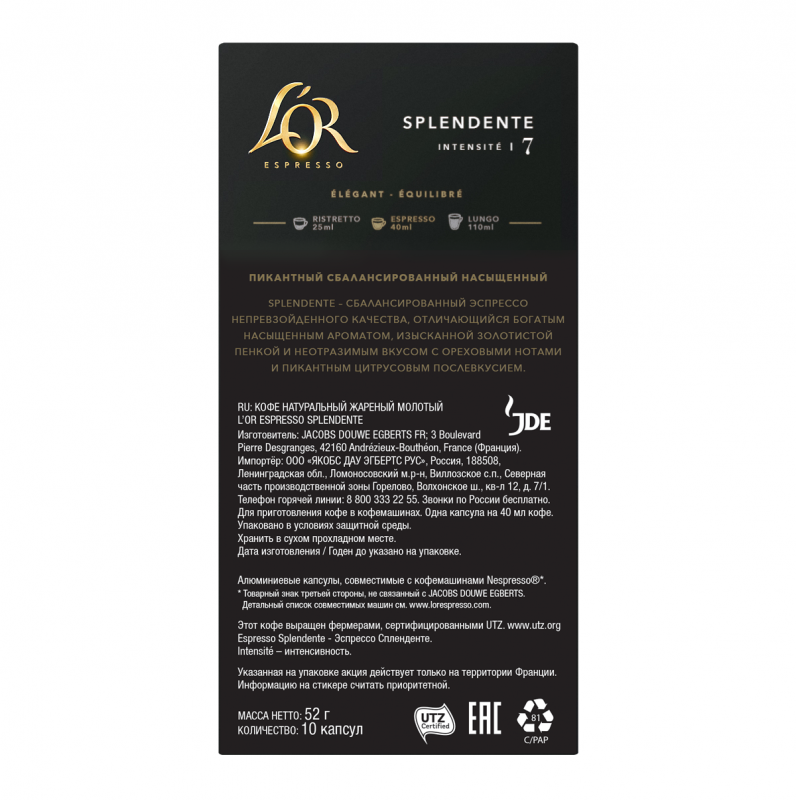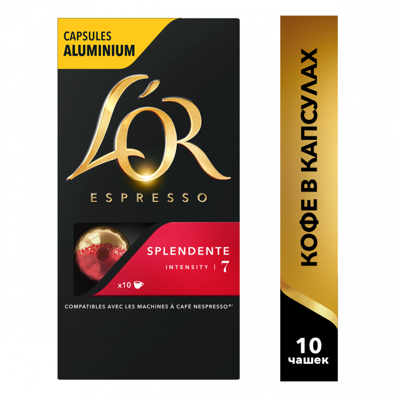 Кофе в капсулах L'OR Espresso Splendente, интенсивность 7, 10 кап. в уп., 10 уп.