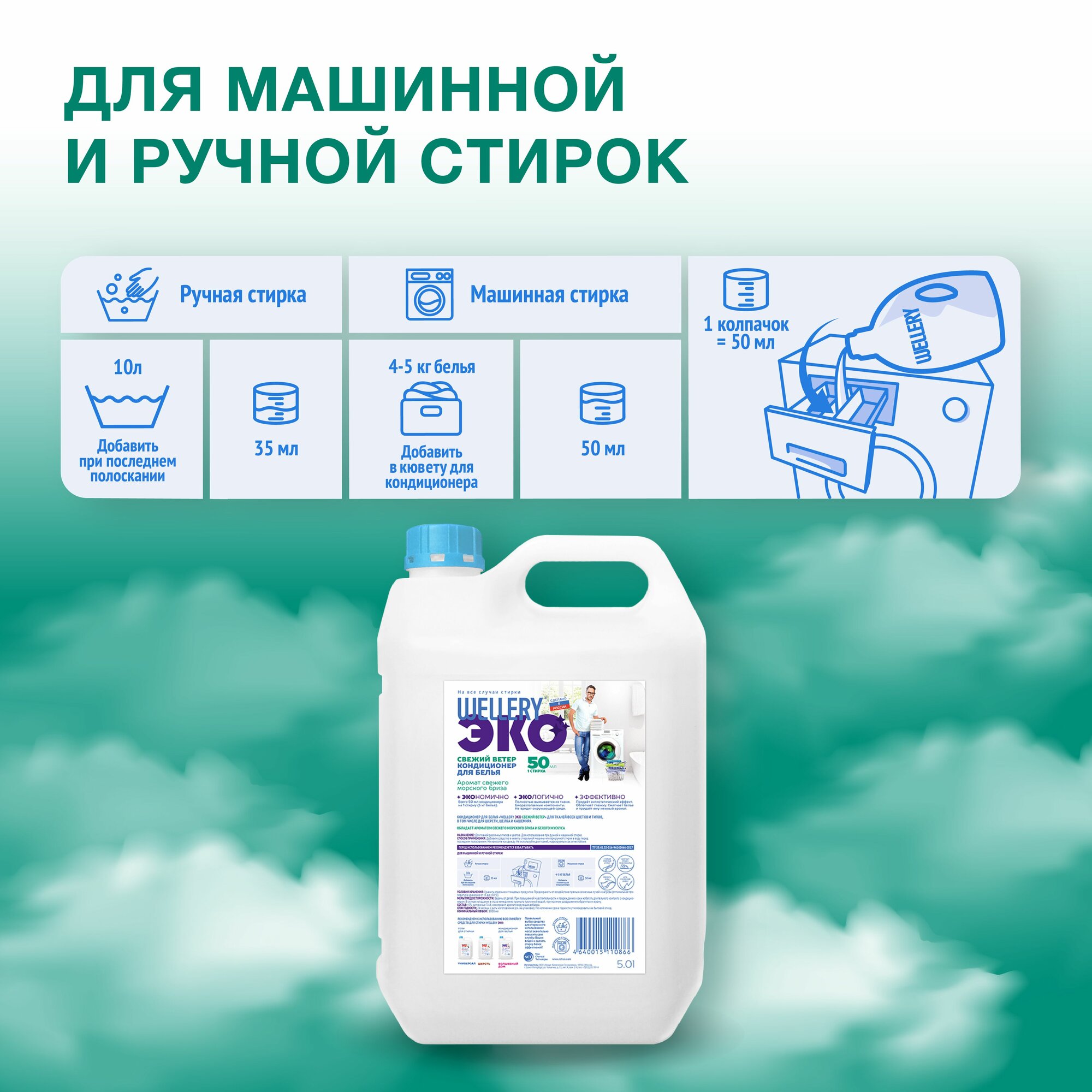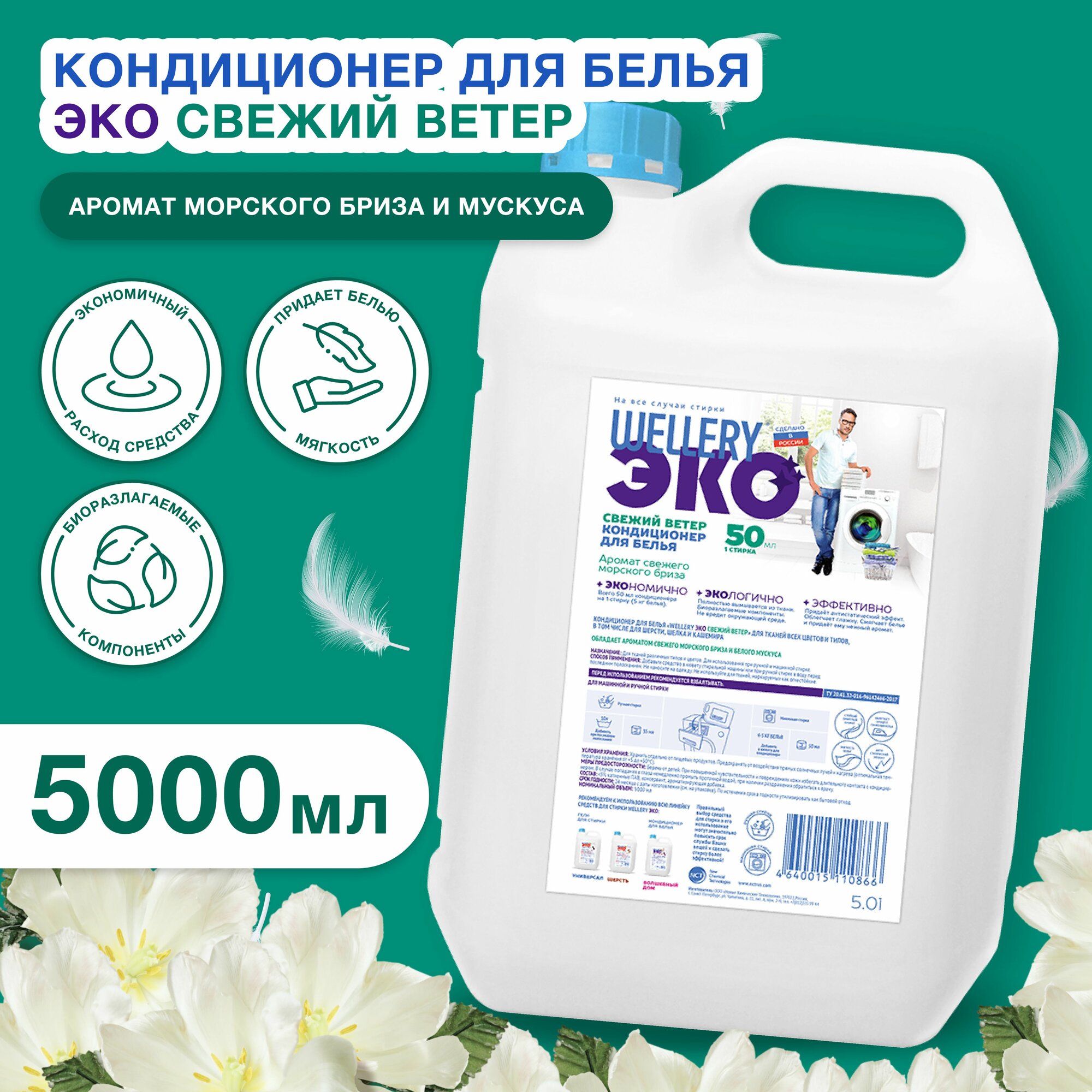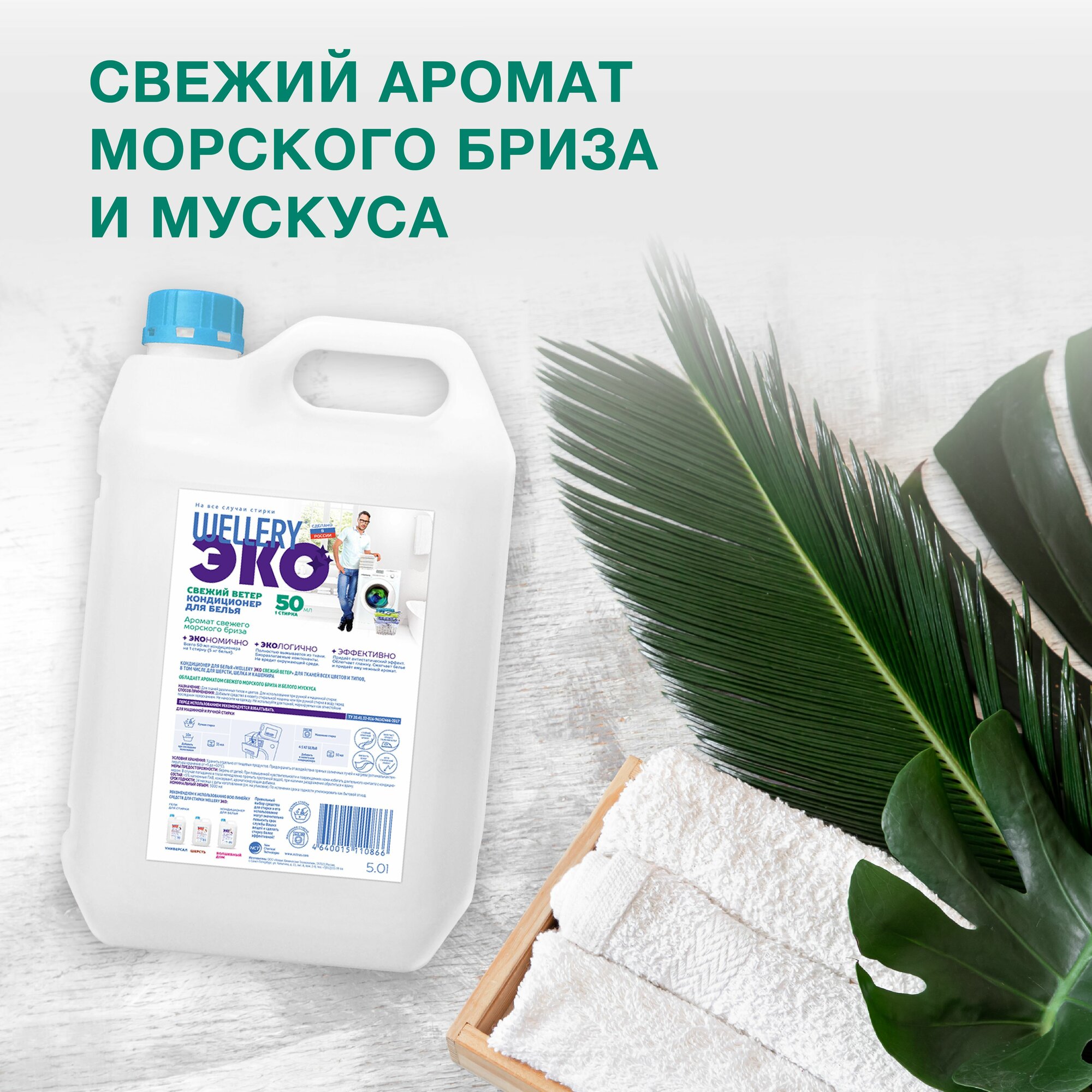 Парфюмированный кондиционер для белья "WELLERY Эко Свежий ветер" морской бриз и мускус, канистра,5л
