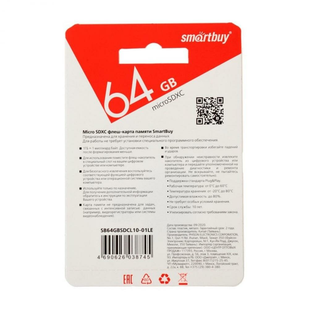 Карта памяти 64Gb MicroSD SmartBuy (SB64GBSDCL10-00)