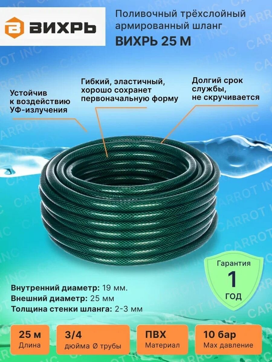 Шланг поливочный вихрь ПВХ, трёхслойный армированный 3/4", 25м
