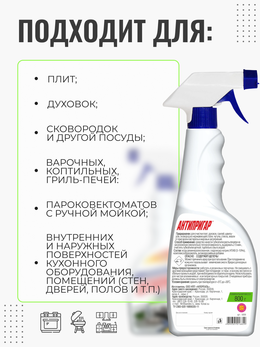 Флореаль Антипригар Эффективный очиститель пригаров на посуде и плитах 800 гр с распылителем