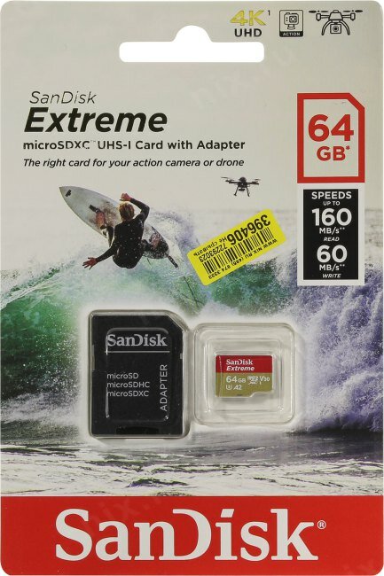 Карта памяти Micro SecureDigital 64Gb SanDisk Extreme microSDXC class 10 UHS-1 U3 V30 A2 (SDSQXAH-064G-GN6MN)