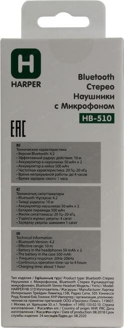 Гарнитура HARPER HB-510, Bluetooth, вкладыши, черный [h00002183]