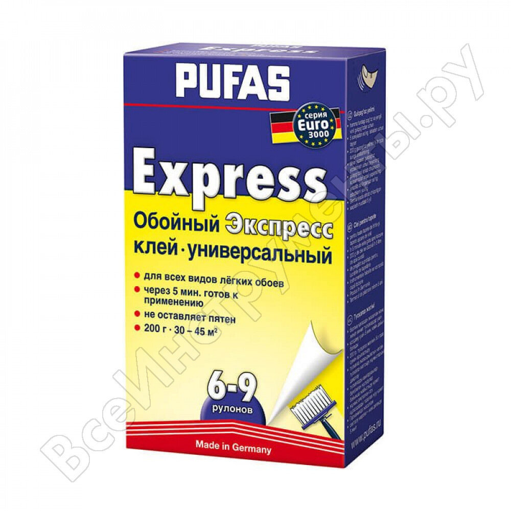 Пуфас 051 клей для бумажных обоев Экспресс (0,2кг) / PUFAS N051 Express Euro 3000 клей обойный универсальный быстрорастворимый (200г)
