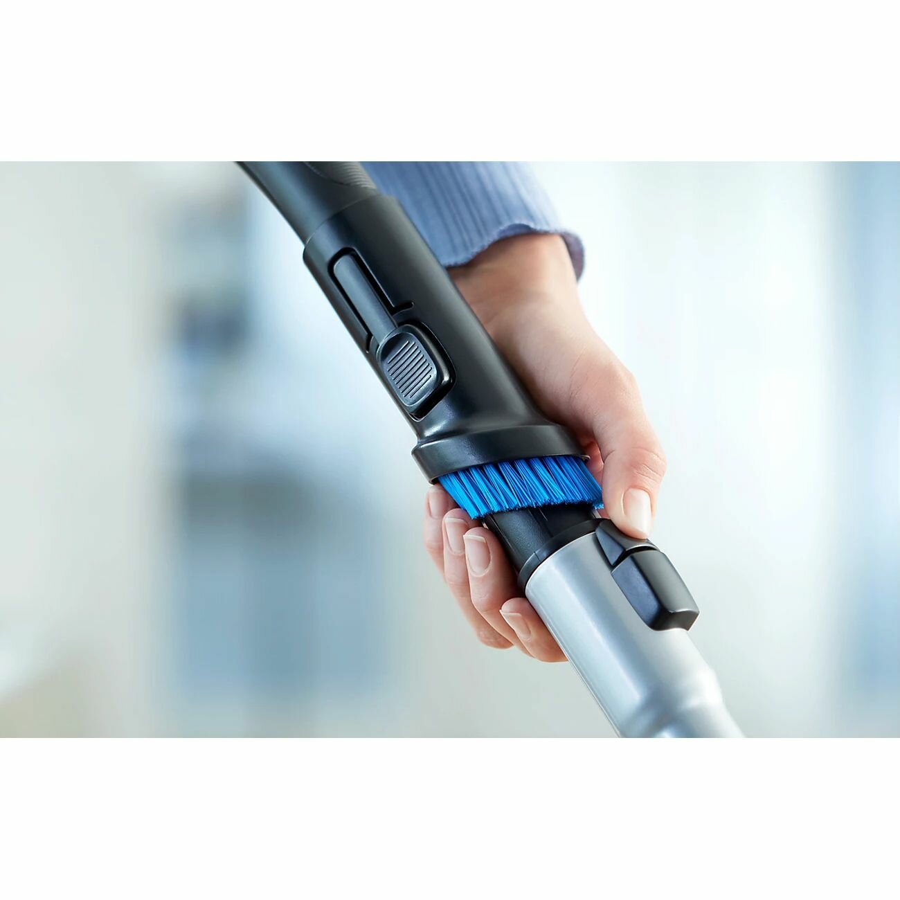Очень удобно, что щетка для очистки мебели встроена в ручку. Щелевая насадка тоже крепится защелкой на трубке. Не очень шумный. Также здесь резиновые, а не просто пластиковые колеса. |