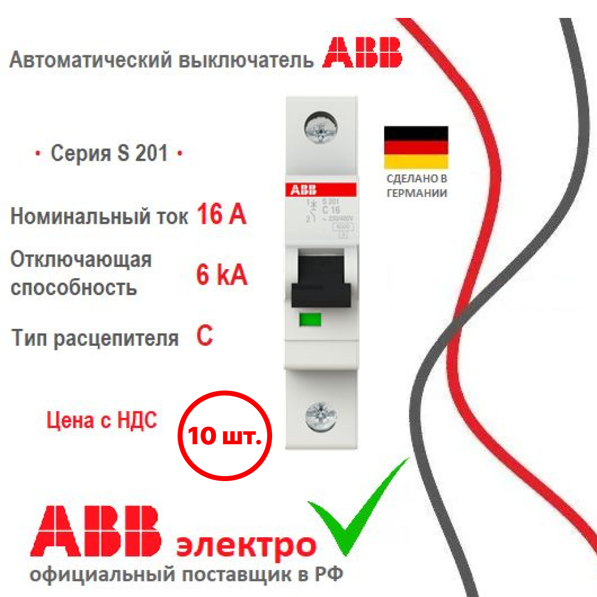 Автоматический выключатель 1P (1П) 16А тип C 6кА S201 ABB 2CDS251001R0164 10шт