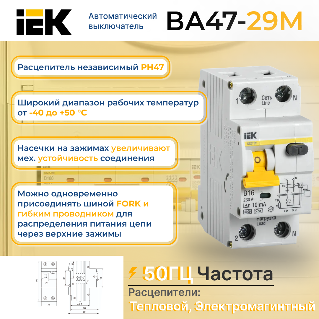 Дифференциальный автомат IEK АВДТ32 2П 10 мА B 6 кА A электронный 16 А
