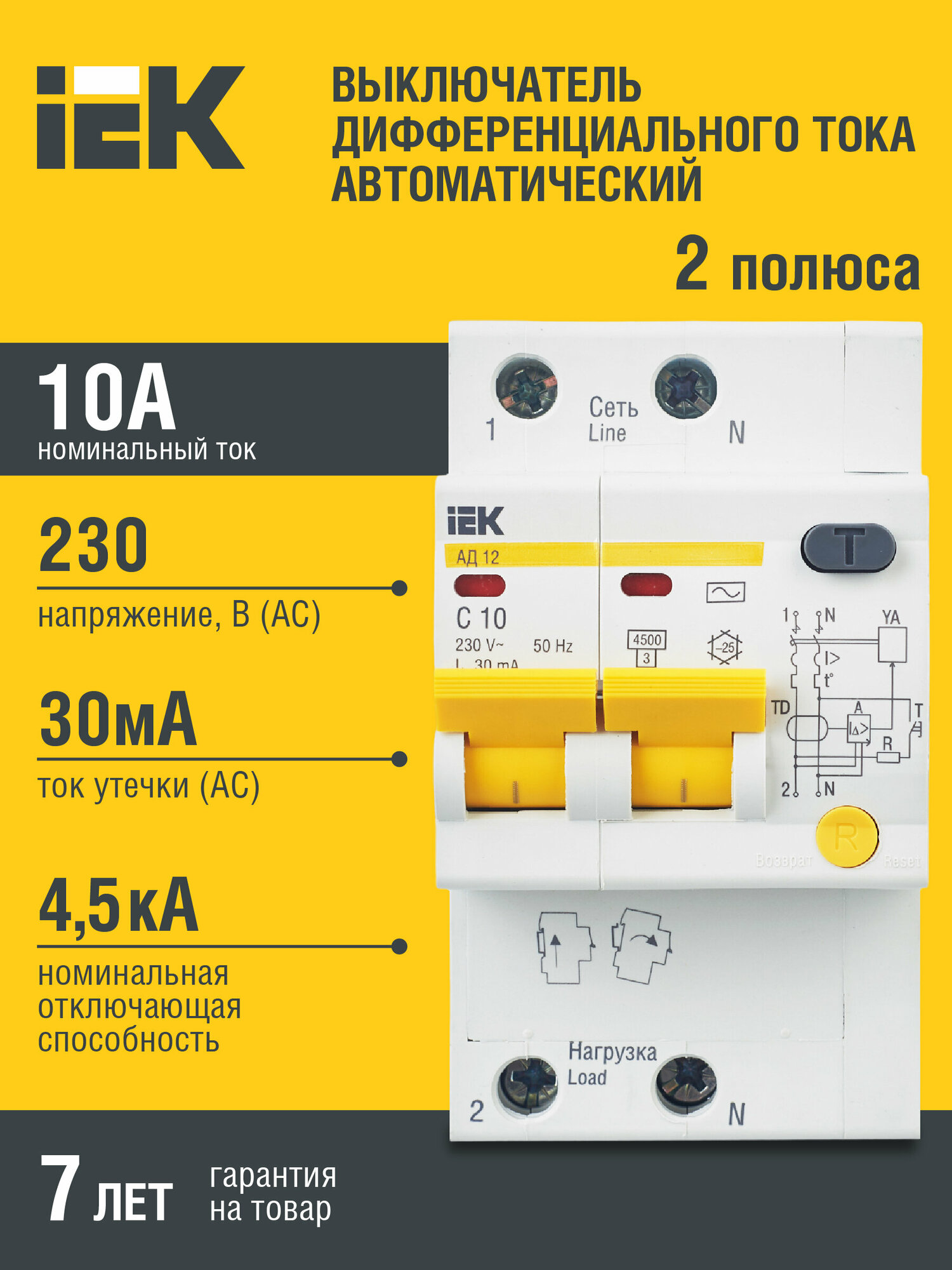 СохранитьДифференциальный автоматический выключатель двухполюсный IEK АД12 10А, 30мА, тип AC, характеристика C интересное: