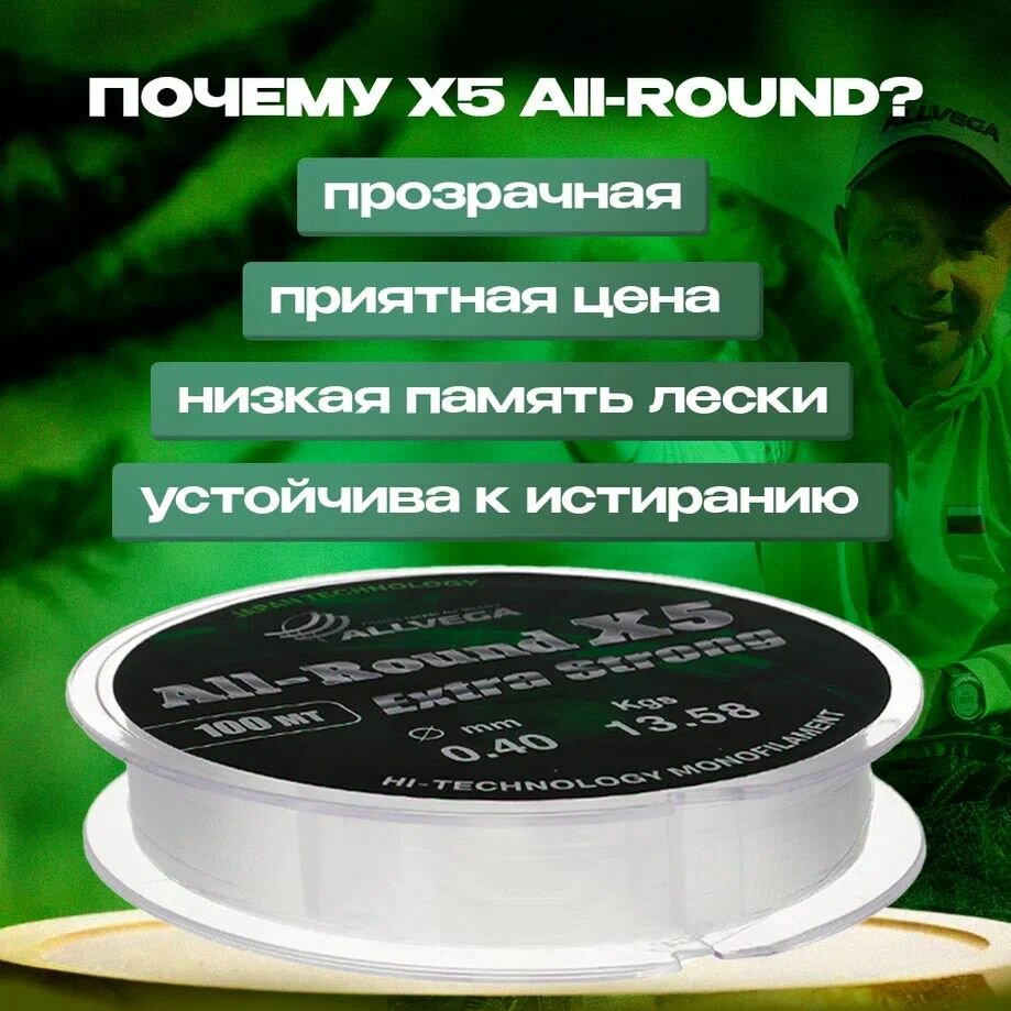 Леска монофильная ALLVEGA ALL-ROUND X5 0.40мм (100м) (13, 58кг) (прозрачная)