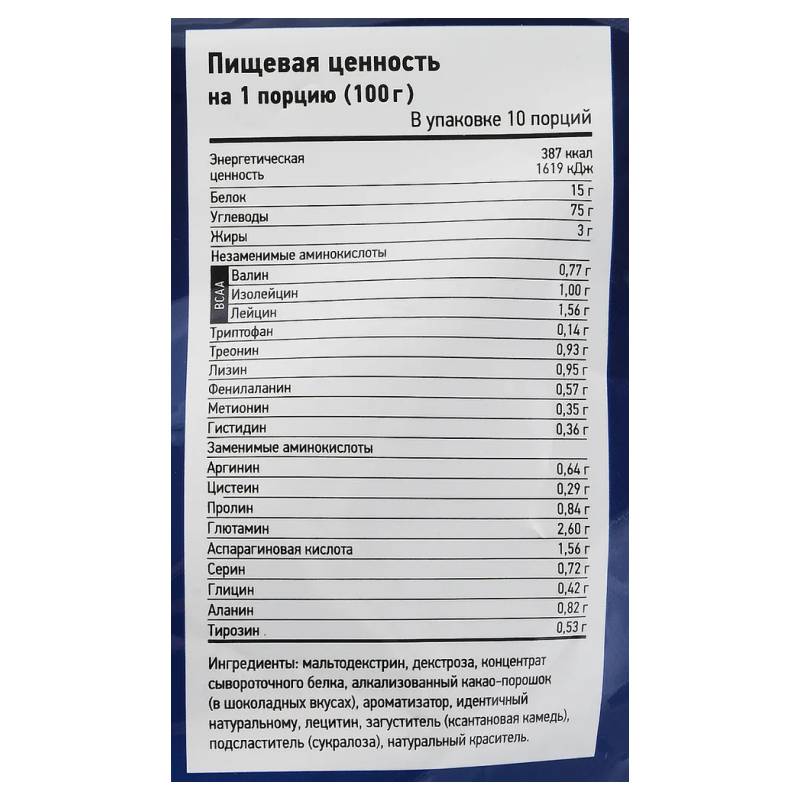 | Отзыв: | Хорошо растворяется, но растворяйте его в теплом молоке. Рабочий 100%, есть витамины и bcaa. Беру его всегда. Бывает что 3кг можно взять за 1300руб. Не дорогой. |