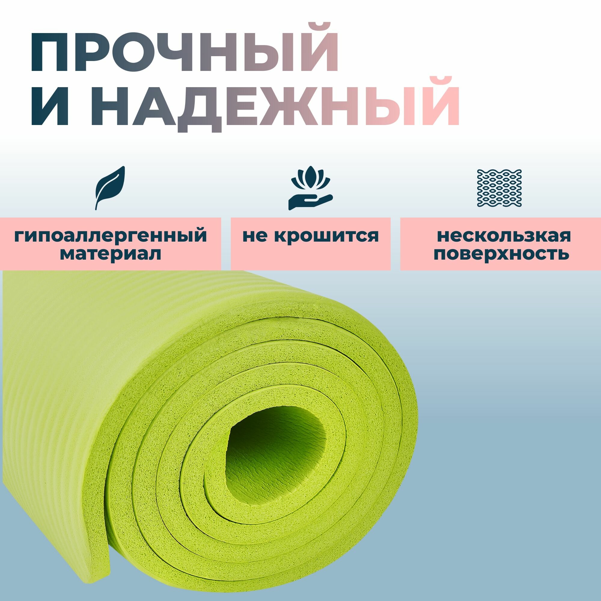 | Плюсы: | Не чувствуется пол, мягкий, не скользит, йогой заниматься очень удобно, есть ремни, чтоб хранить в сложенном виде, цвет насыщенный |