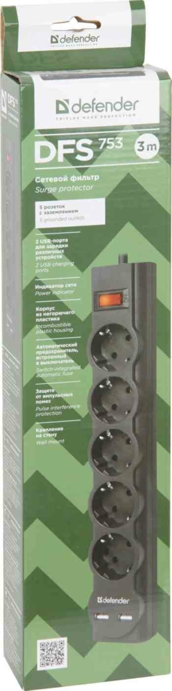 Сетевой фильтр DEFENDER DFS753, 5 розеток, ПВС 3*1,0 мм2, мощность 2200 Вт, ток 10А, черный, 3,0 м 2xUSB, 2.1A