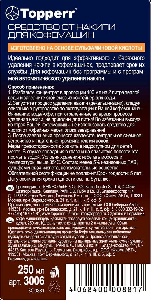 Аксессуар для кофемашины Topperr 3006 средство от накипи для кофемашин 250 мл