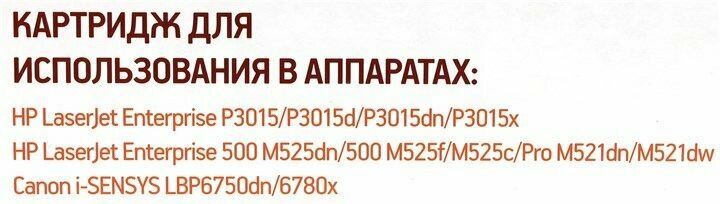 | Модель совместимого принтера | Canon i-SENSYS LBP6750dn / Canon i-SENSYS LBP6780x / Canon i-SENSYS MF512x / Canon i-SENSYS MF515x / HP LaserJet Enterprise P3015x |