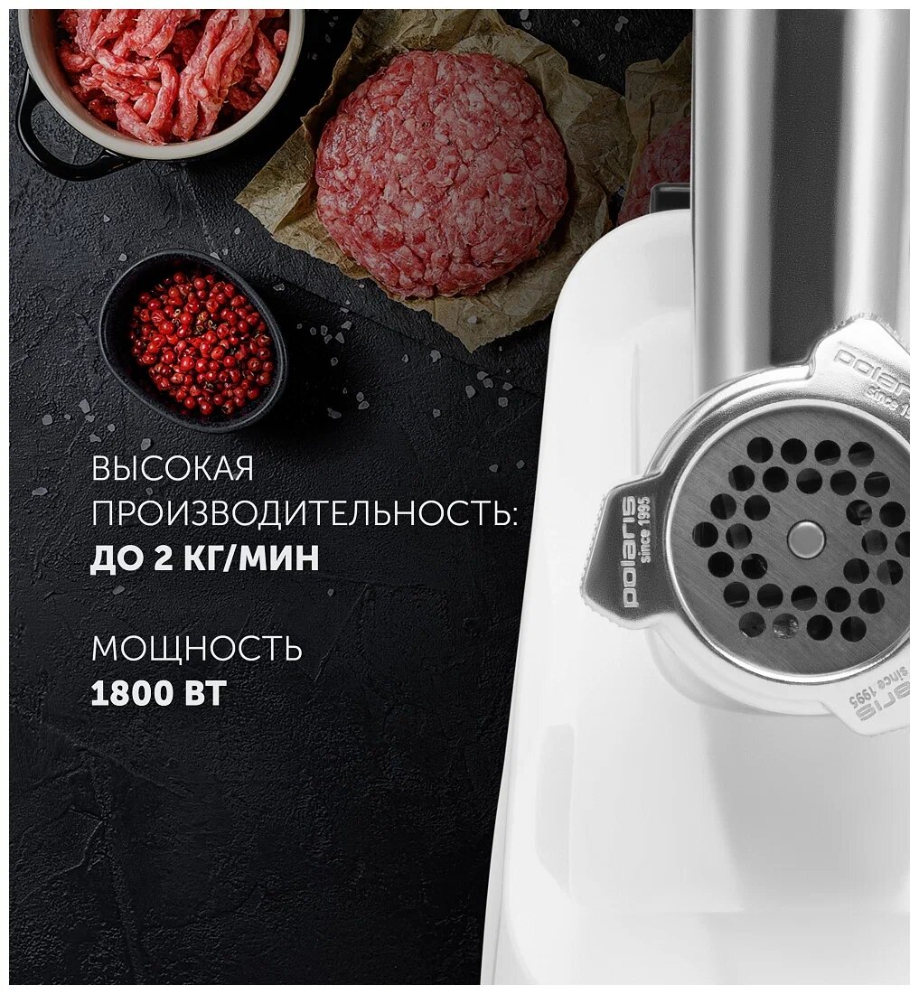 Мясорубка POLARIS PMG 1852, 1800 Вт, производительность 2 кг/мин, 2 насадки, реверс, белый, 61222