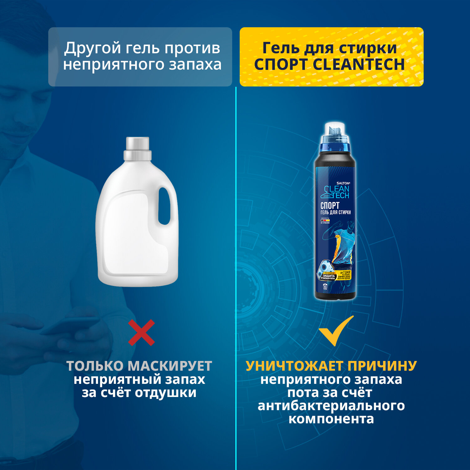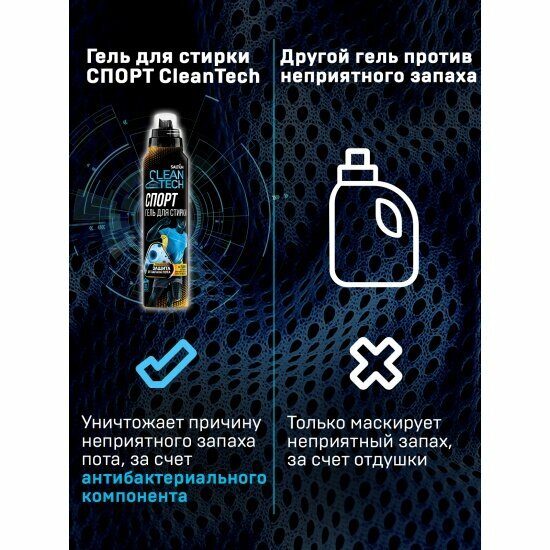 Классный гель, вот прям рекомендую! Стираю всю форму из зала и мужа футболки только Salton CleanTech. С этим гелем вся одежда надолго сохраняет свежесть и аромат, нет запаха пота. Отстирывает замечательно, содержит антибактериальный компонент, который устраняет причину запаха пота и сохраняет чистоту одежды до 7 дней. Мы конечно неделями одни и те же вещи не носим, но в течение дня от вещей только запах свежести исходит.