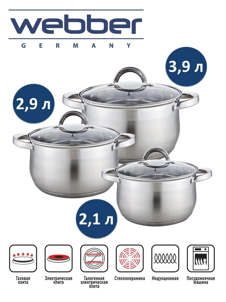 Webber Be-616/6 Набор Посуды Из Нерж.стали 6 Пр. 2,1Л, 2,9Л, 3,9Л Со Стеклянными Крышками