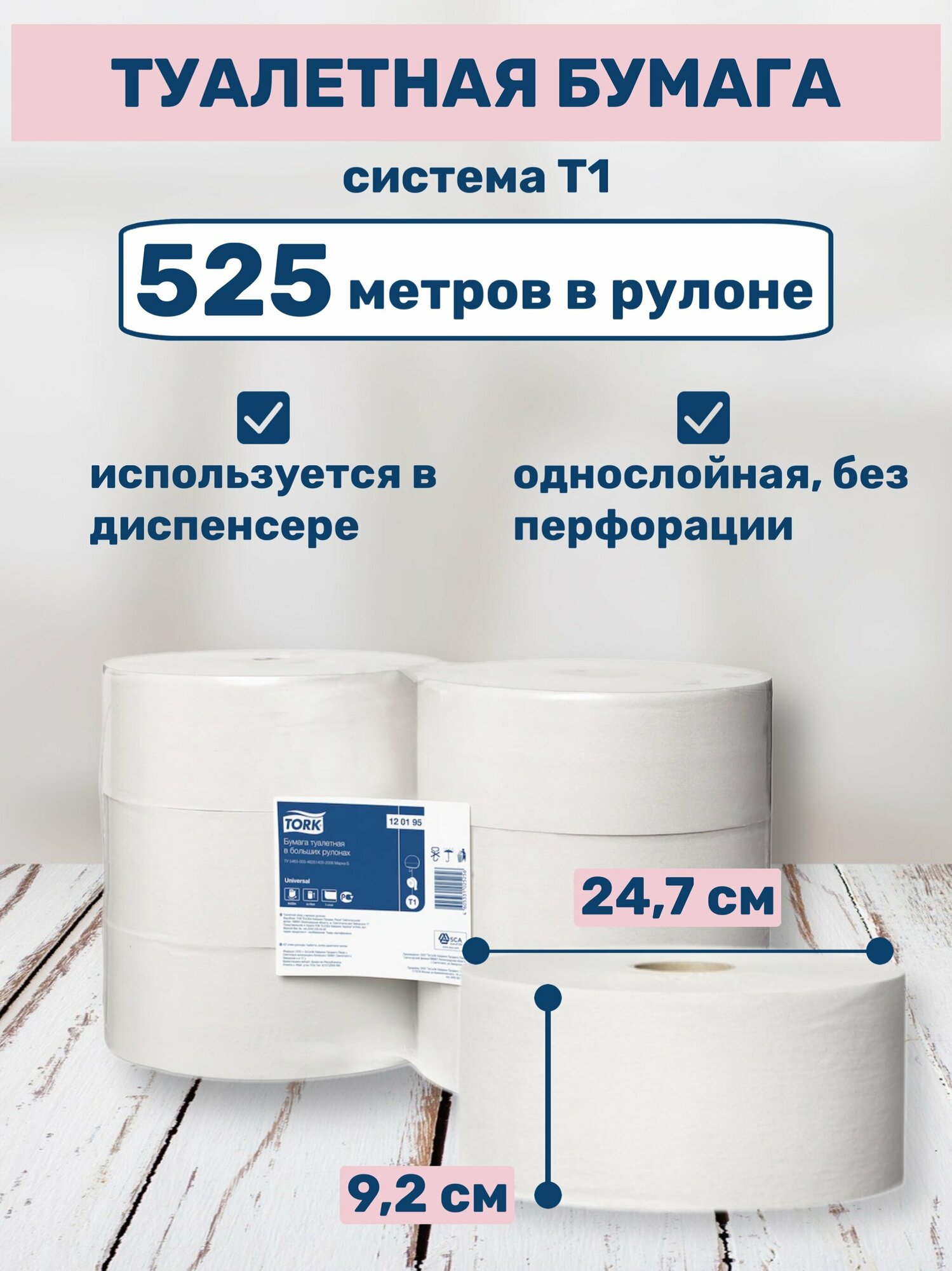 Бумага туалетная 525 метров большой рулон, TORK (Система T1) UNIVERSAL, 1-слойная, комплект 6 рулонов, 120195