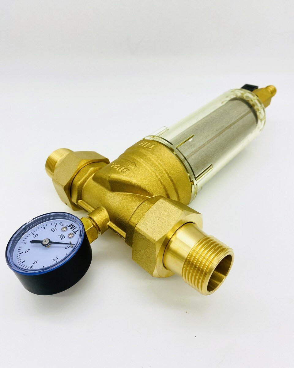 Фильтр самопромывной 1" НН, для холодной воды с манометром, американками и сливным краном, стеклянный корпус TIM арт. JH-3002