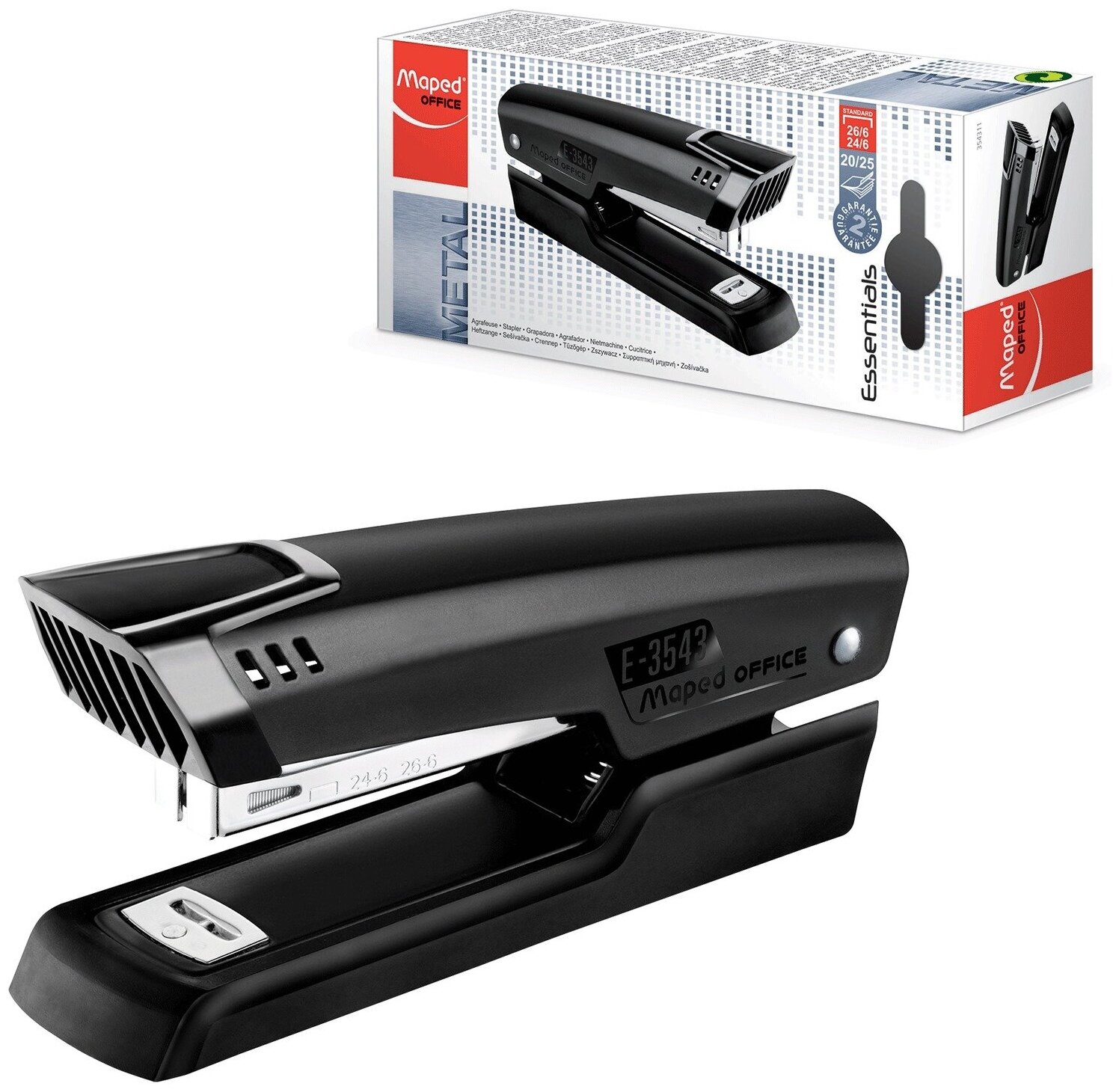 Степлер №24/6, 26/6 металлический MAPED (Франция) "Essentials Metal", до 25 листов, черный, 354311