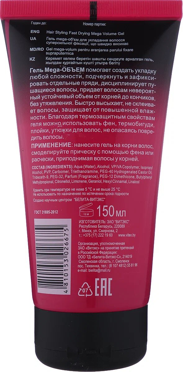Гель для волос Белита Гель для волос Мега-объем для укладки волос быстросохнущий суперсильной фиксации - Белорусская косметика