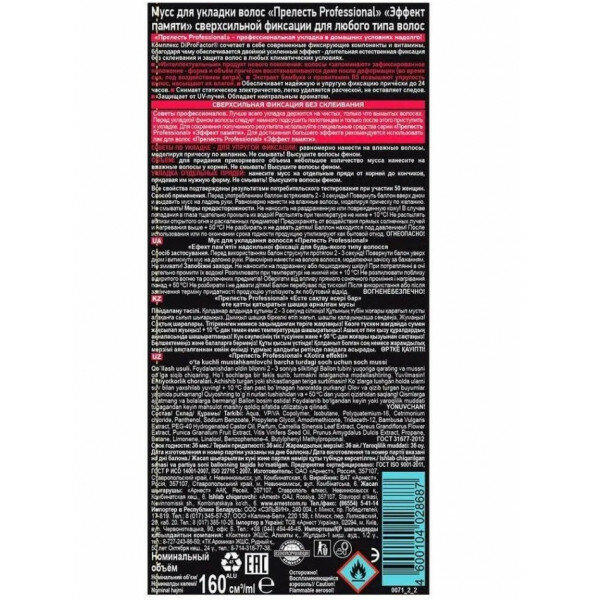 Мусс для укладки волос Прелесть, Professional, Эффект памяти, сверхсильная фиксация, 160 мл