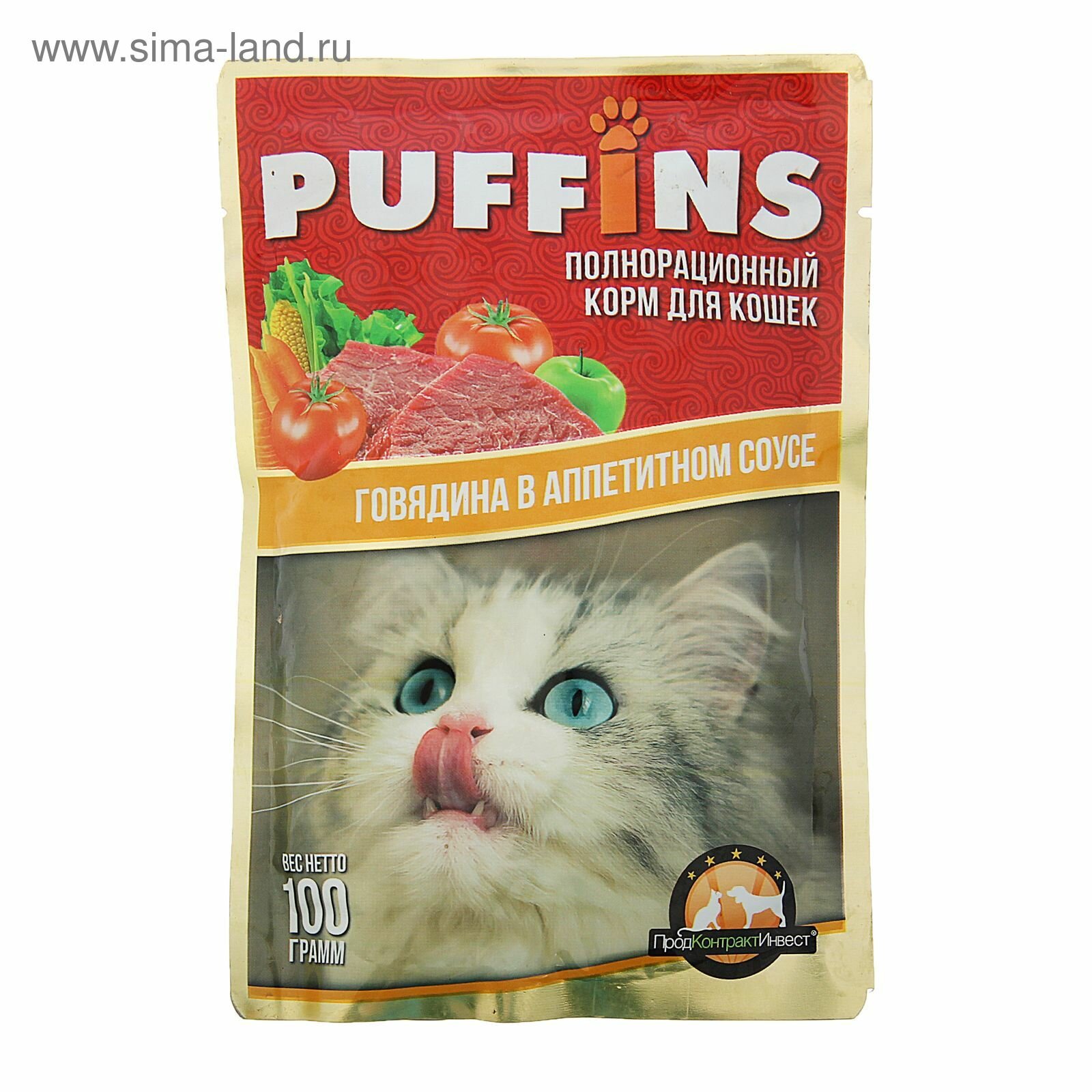 Купить Влажный корм "Puffins" для кошек, сочные кусочки говядины в соусе, 100 г