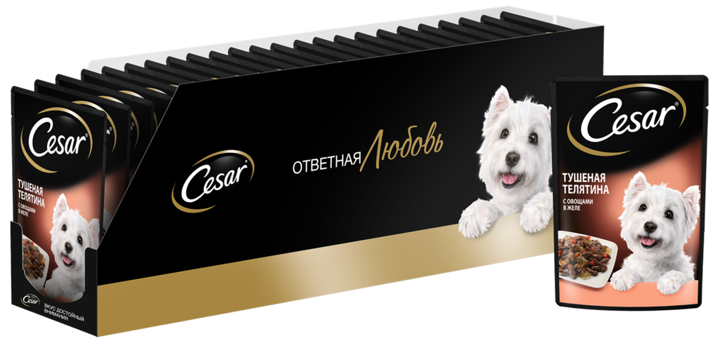 Cesar Паучи для взрослых собак, с тушеной телятиной и овощами в желе, 85г 10222849, 0,085 кг, 43492 (44 шт)