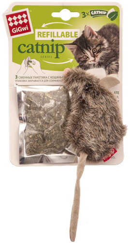 Игрушка для кошек GIGWI Refillable catnip Мышка с кошачьей мятой, коричневая (10 см/3 пакетика с кошачьей мятой)