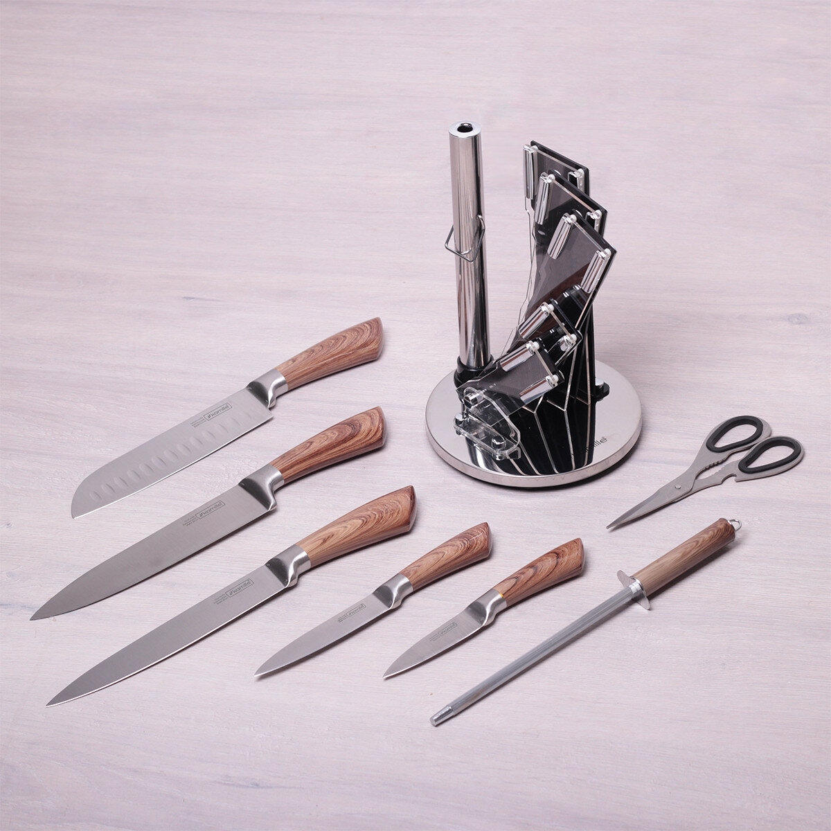 Набор кухонных ножей и ножницы на акрил.подставке 8пр (5 ножей+ножницы+точилка+подставка) 5048 интересное:
