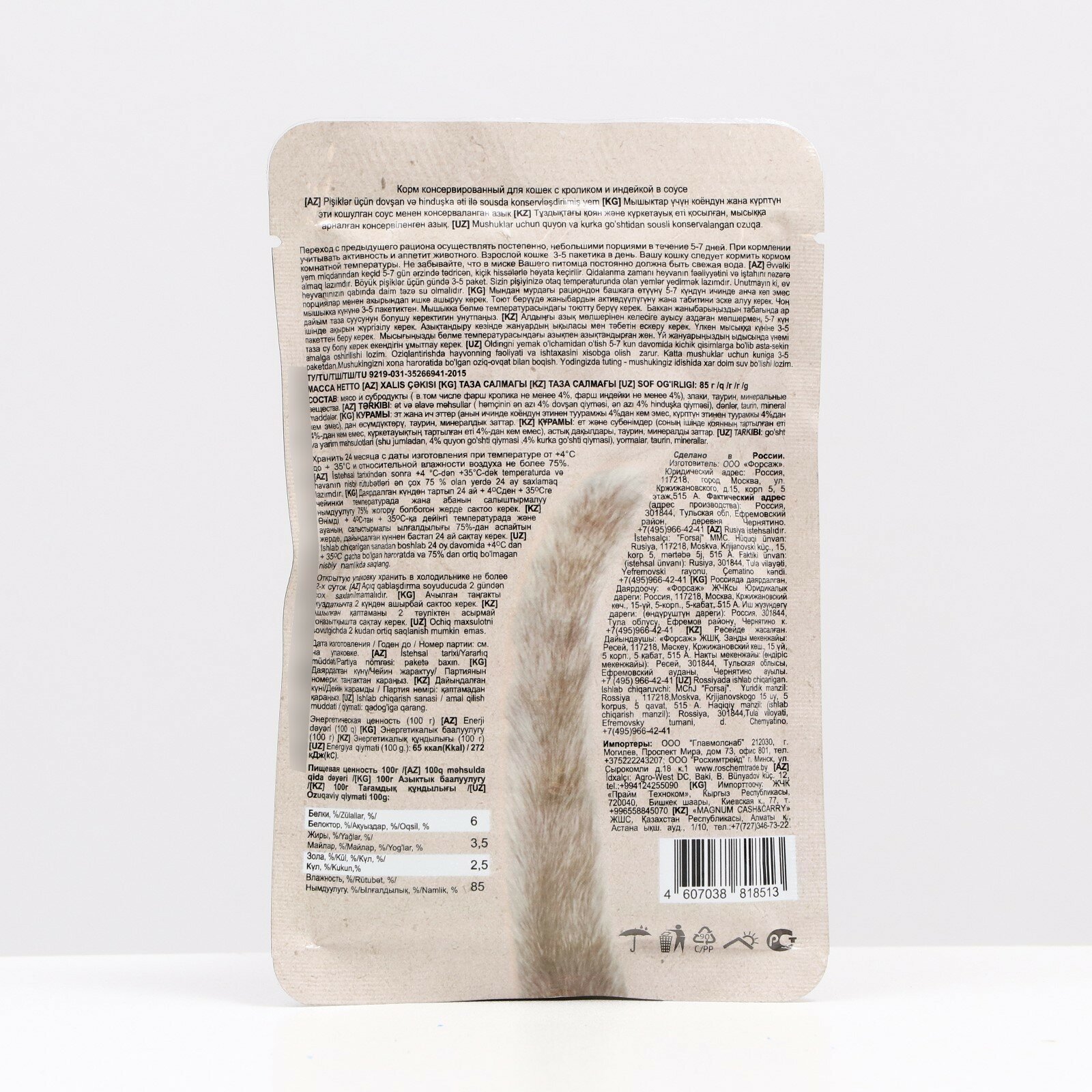 Влажный корм Chammy для кошек, кролик/индейка в соусе, пауч, интересное: