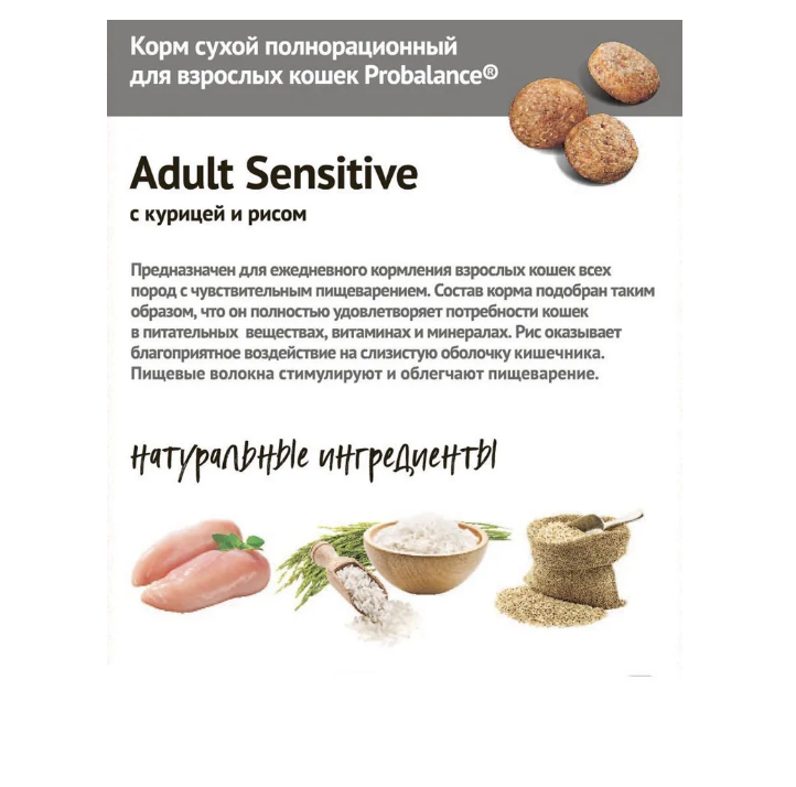 Корм ProBalance Sensitive для взрослых кошек с чувствительным пищеварением, с курицей и рисом, 1,8 кг