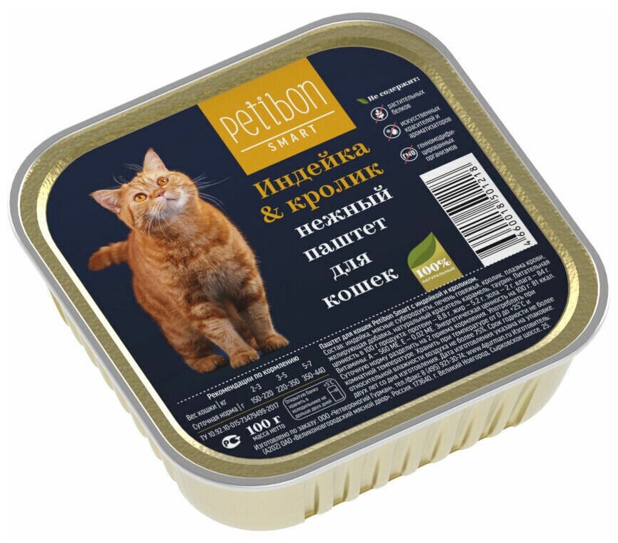 Корм консервированный для кошек Petibon "Smart Паштет", с индейкой и кроликом, упаковка 24 шт х 100 г