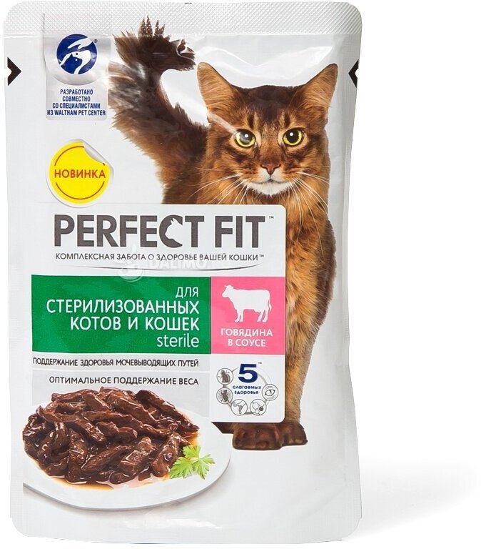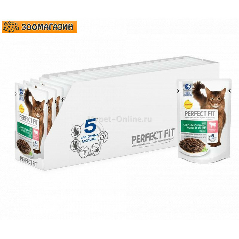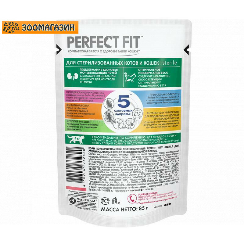 Корм для кошек PERFECT FIT Sterile для стерилизованных, говядина в соусе пауч 75г (упаковка - 28 шт)