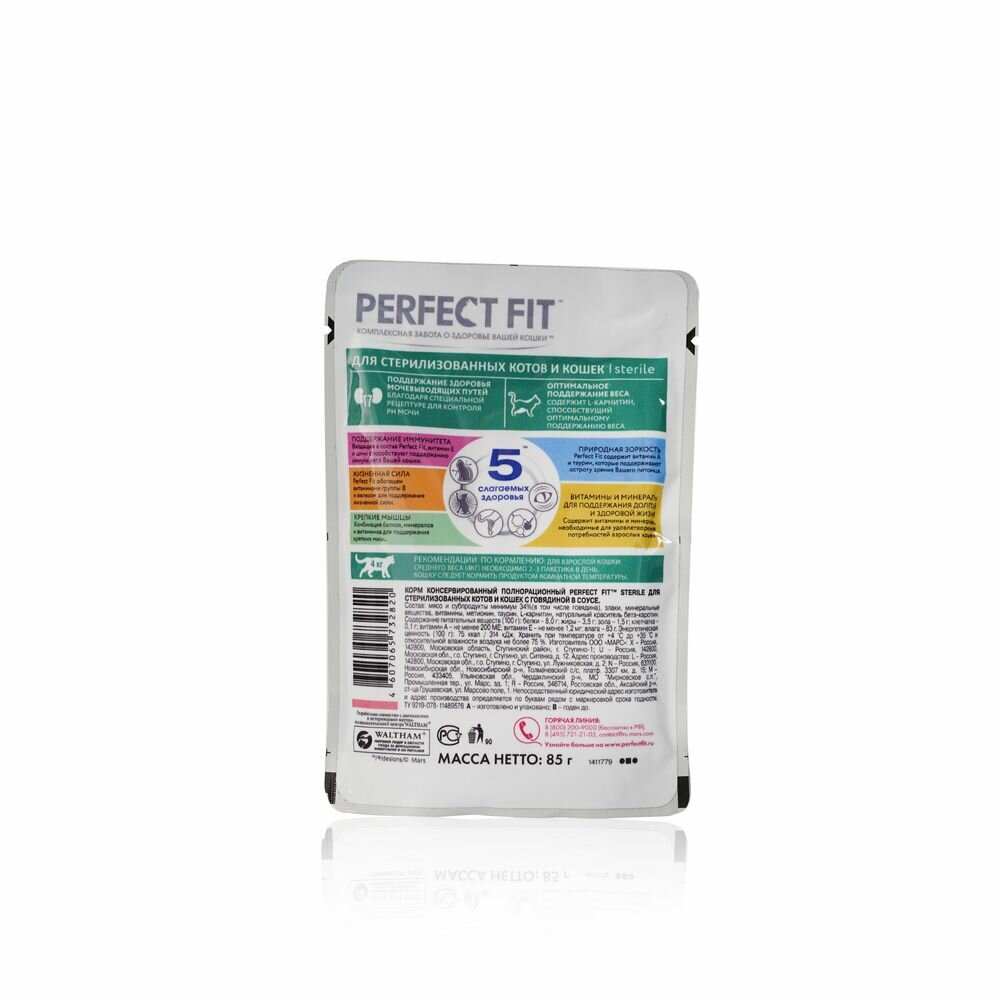 Влажный полнорационный корм Perfect Fit для стерилизованных кошек, говядина в соусе, 75г х 28шт