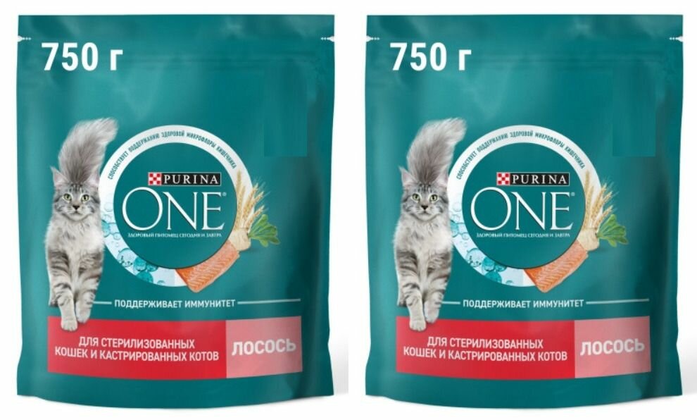 Набор PURINA ONE 2 шт х 750 г Сухой корм для стерилизованных кошек и кастрированных котов, с высоким содержанием лосося и пшеницей 750 г