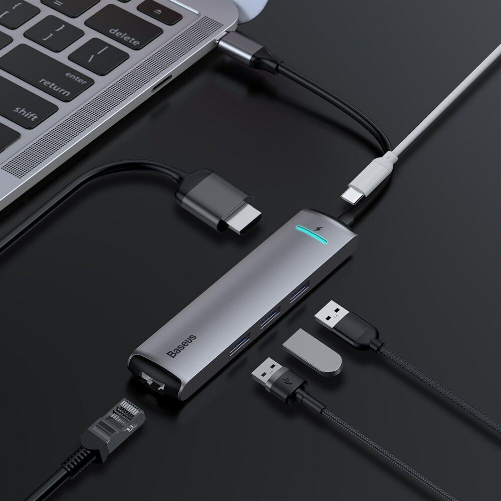Купить Хаб Baseus Mechanical eye Six-in-one smart HUB Type-C to PD+HDMI+3xUSB3.0+RJ45 серый (CAHUB-J0G)