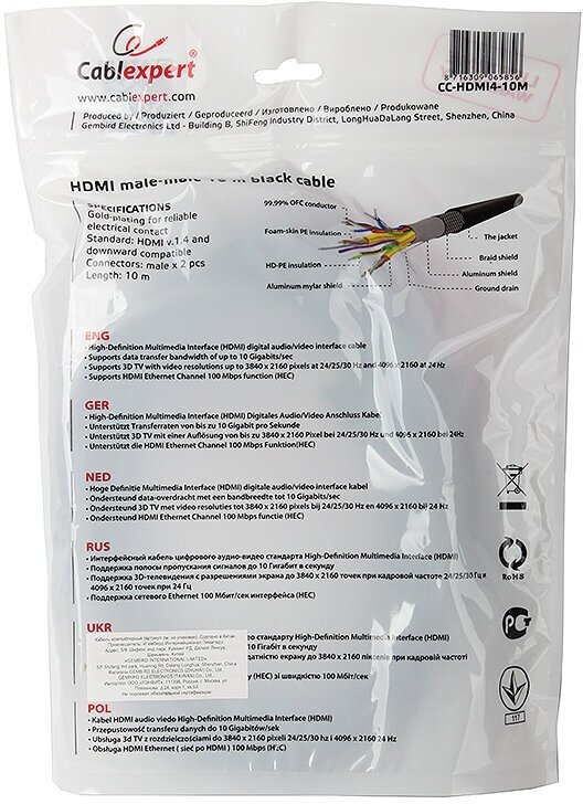 Кабель HDMI Cablexpert CC-HDMI4-10M, 10 м, v2, 0, 19M/19M, черный, позолоченные разъемы, экран