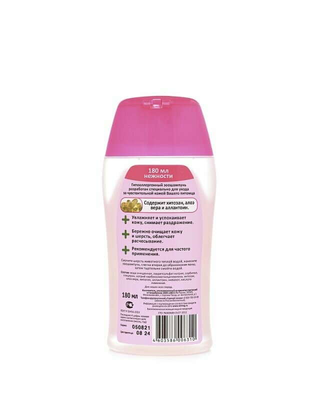 Зоошампунь "нежный" гипоалергенный с хитозаном и аллантоином для кошек, 180 мл