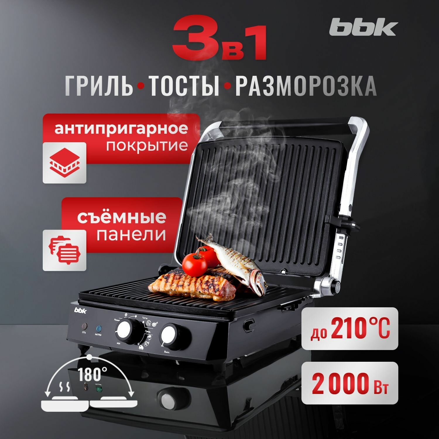 Степень обжарки регулируется; Переключатель питания отдельный; Раскладывается на 180°; Панели съёмные; Широкая и удобная ручка; Подстраивается под толщину продуктов; Есть кювета для слива жира; Дешёвый; |