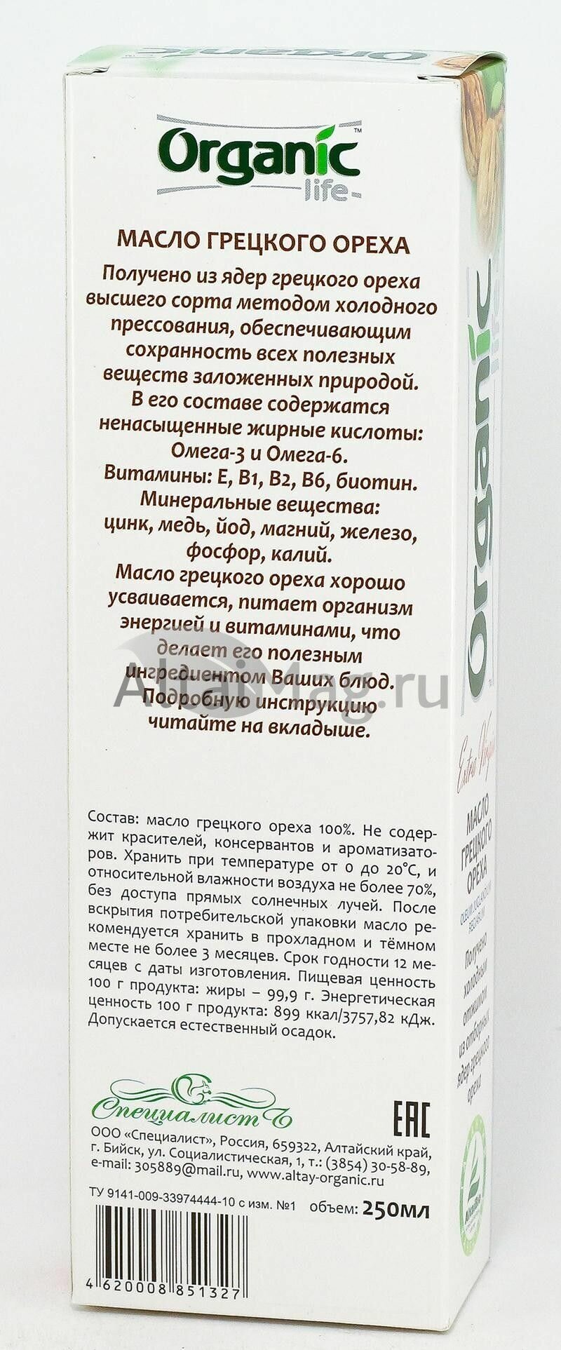 Масло грецкого ореха "Organic", 250 мл, Специалист ООО