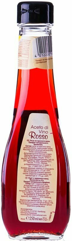 Ниже Вы можете прочитать отзывы на Уксус KUHNE Aceto di vino rosso 6% Винный красный, 250мл, ознакомится с подробными характеристиками, посмотреть интересные обзоры и фотографии на Уксус KUHNE Aceto di vino rosso 6% Винный красный, 250мл.