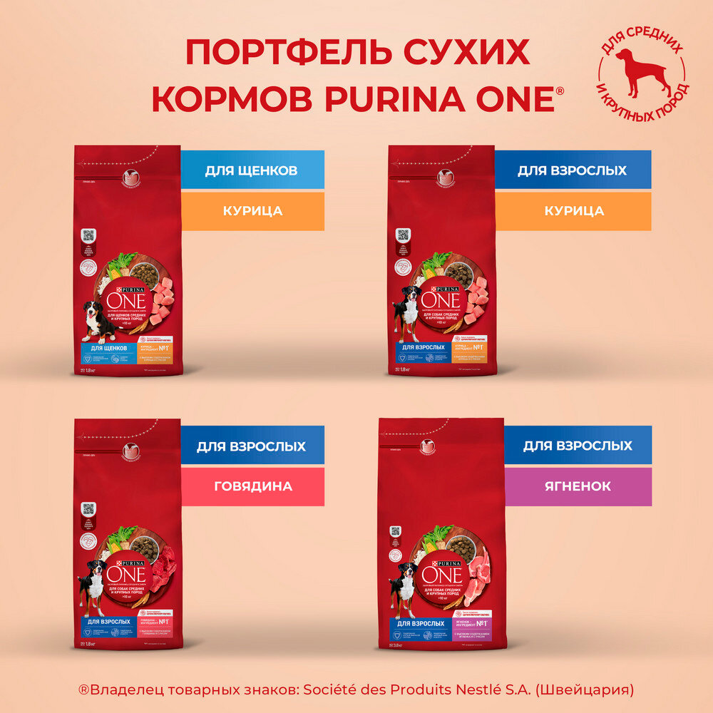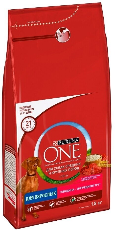 PURINA ONE 1,8 кг сухой корм для взрослых собак средних и крупных пород, с высоким содержанием говядины и с рисом