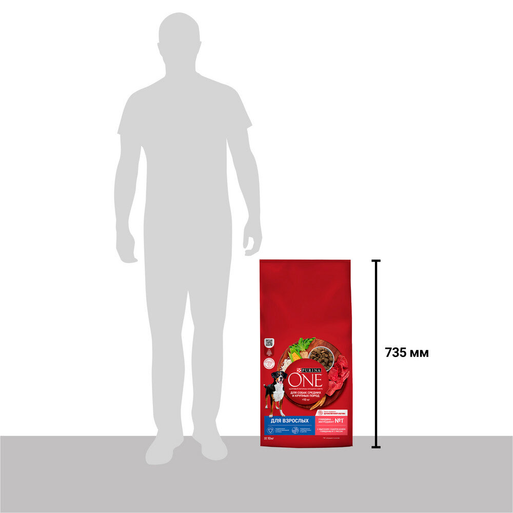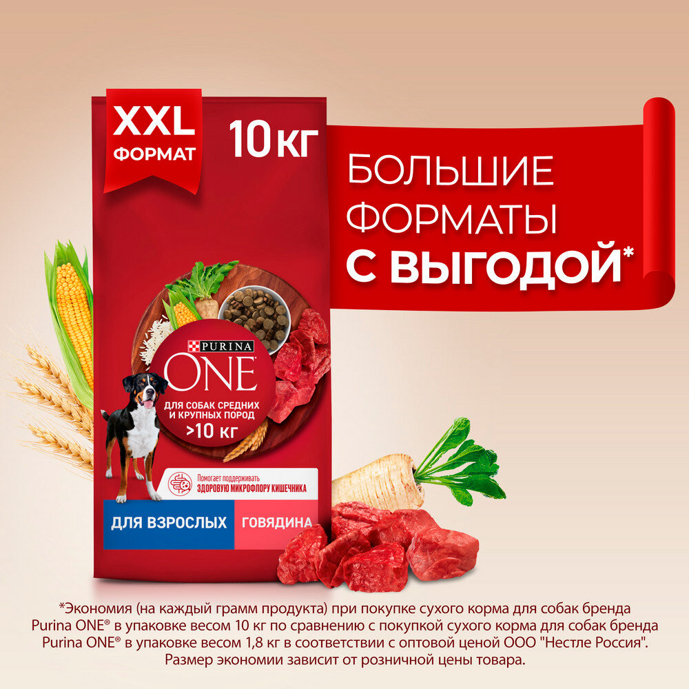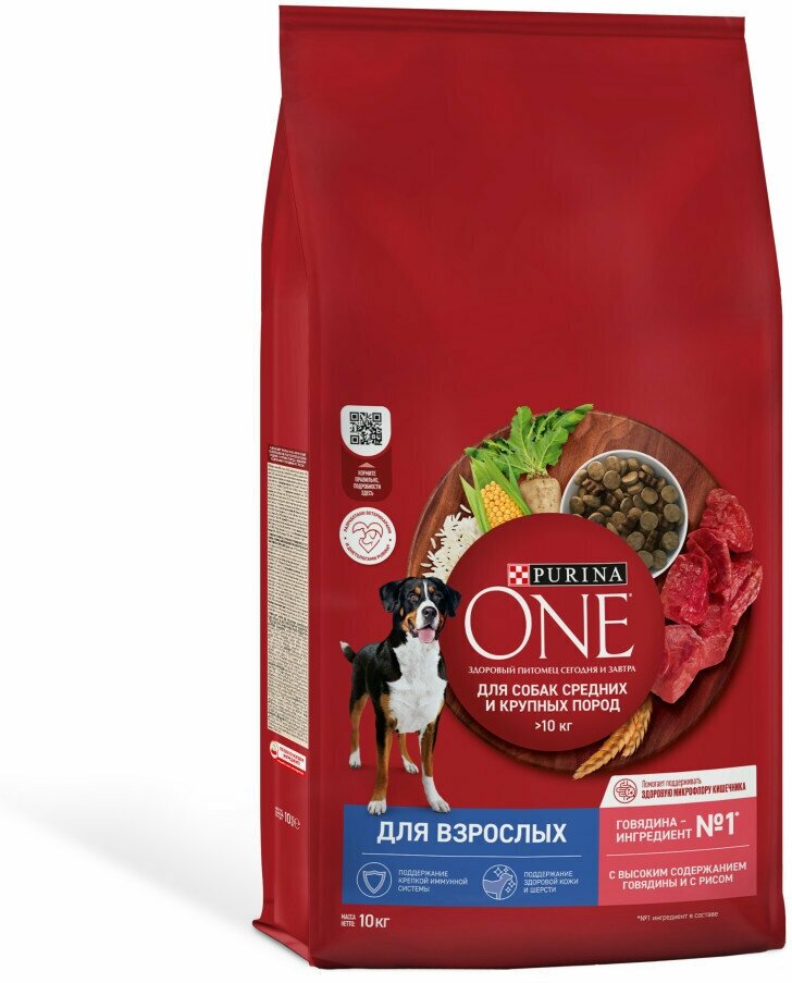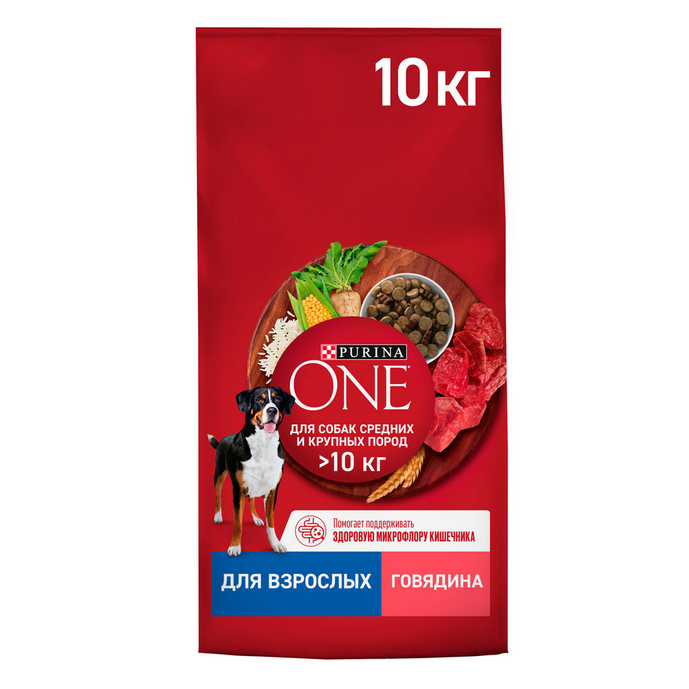 Корм сухой PURINA ONE для взрослых собак средних и крупных пород, с высоким содержанием говядины и рисом, Пакет, 10 кг
