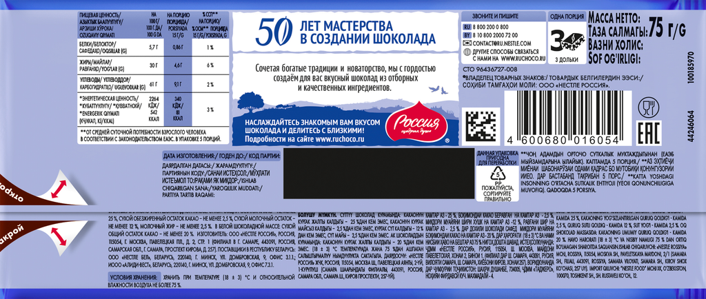 Шоколад Россия - щедрая душа молочный и белый пористый 75г