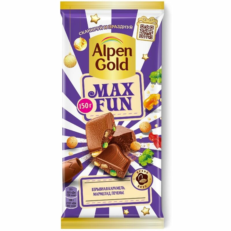 Плиточный шоколад, "Alpen Gold", "Max Fun", молочный, взрывная карамель, мармелад и печенье, 150г