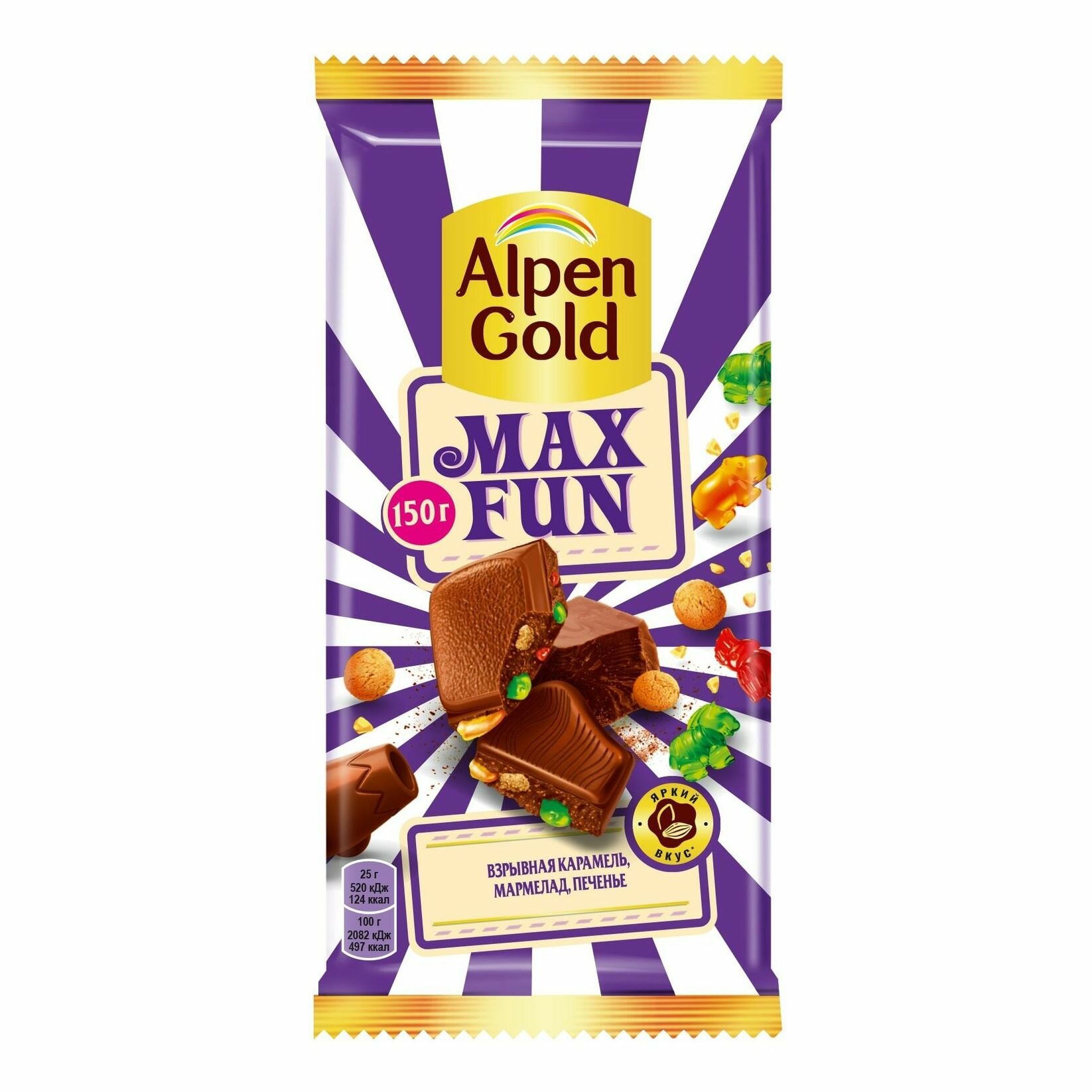 Шоколад ALPEN GOLD (альпен гольд) MaxFun молочный начинка взрывная карамель, мармелад, печенье 150г
